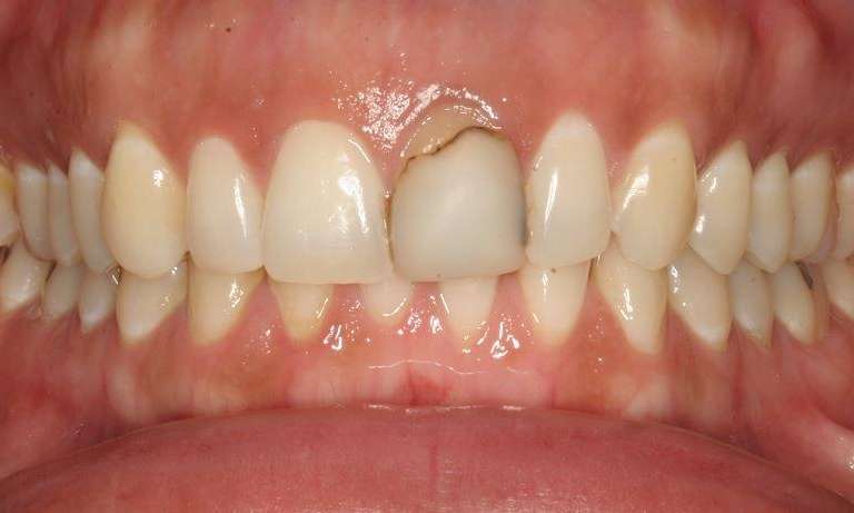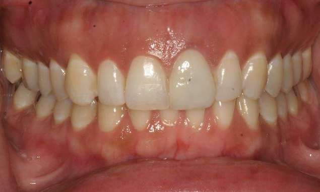 Dr. Schmitt restored this smile with a composite resin veneer. Made of the same material used for dental fillings, composite resin can eliminate many of the same flaws as porcelain veneers.